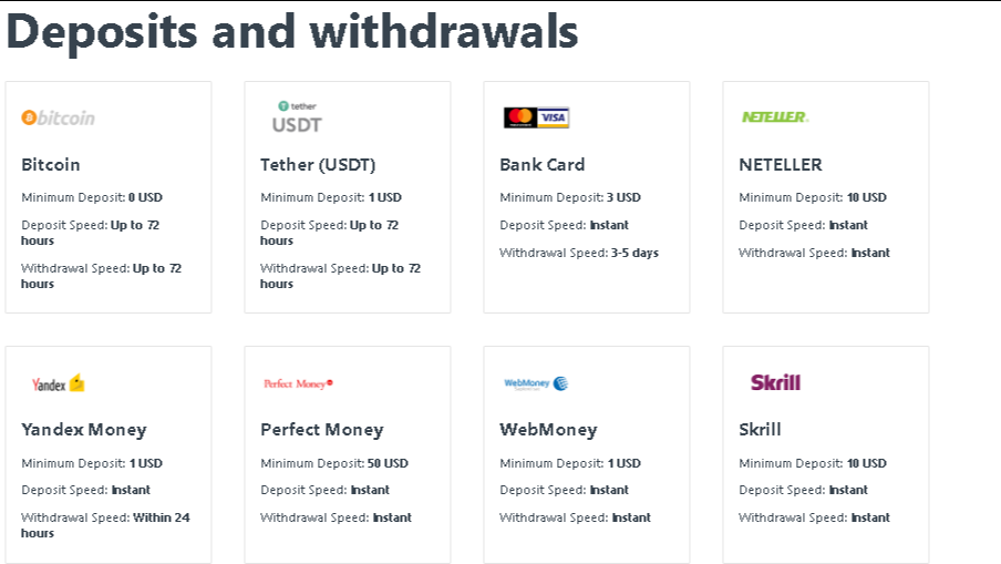 - Cryptocurrencies: Bitcoin, USDT — network confirmation dependent