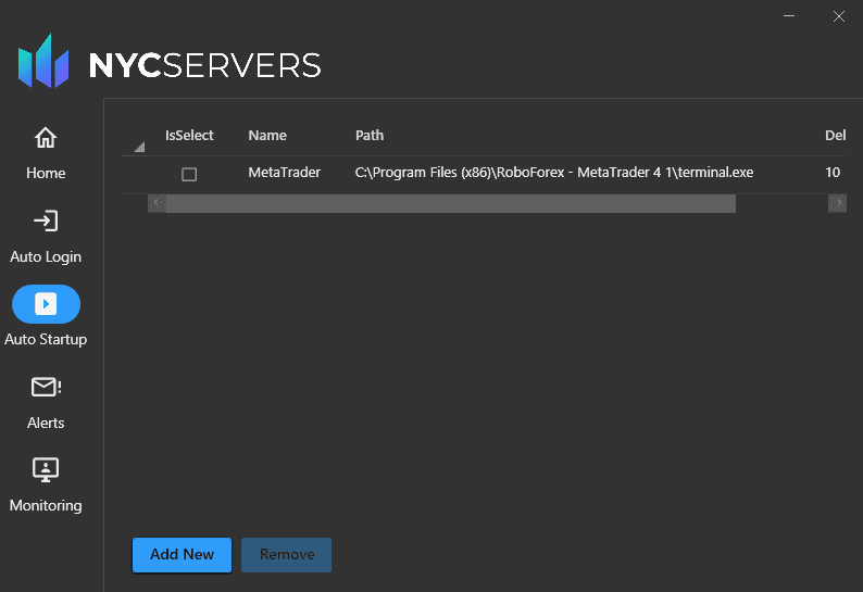 On the auto startup page traders can select which trading platforms they wish to automatically start. This feature is fully compatible with MetaTrader 4, MetaTrader 5, cTrader, and any .exe program.