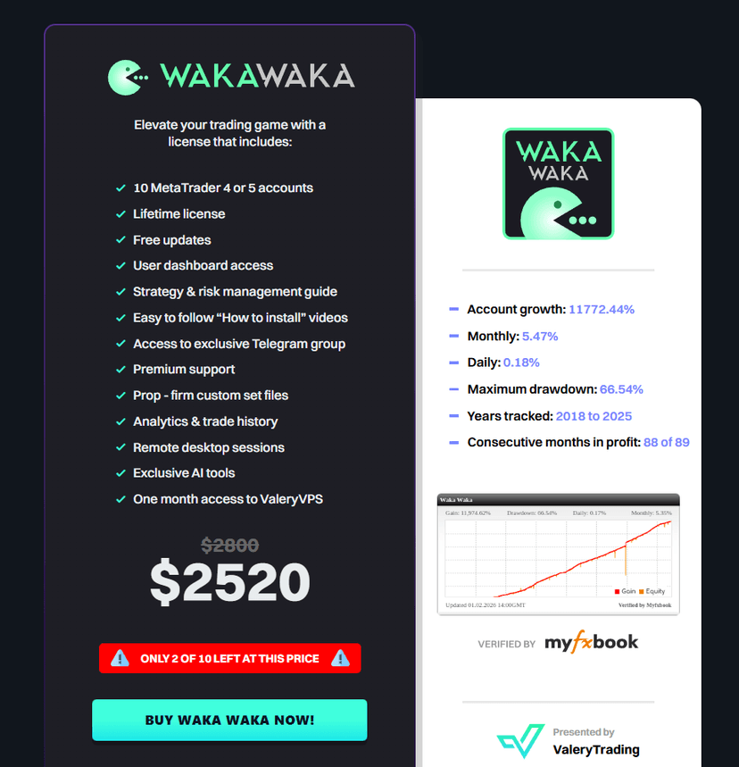 At $2,520, Waka Waka sits at the premium end of the forex EA market. Here’s what the license includes: