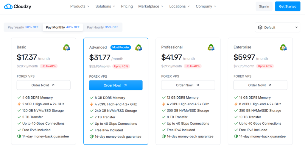 At entry-level configurations, NYCServers ($25/mo) is actually cheaper than Cloudzy ($28/mo) on a monthly basis. Cloudzy’s Basic plan includes more RAM (4GB vs 2GB), but NYCServers includes financial trading focus, broker-specific platform installation, and knowledgable trading related support—features Cloudzy doesn’t offer. Cloudzy operates as a general-purpose cloud provider; NYCServers operates specialized infrastructure inside financial data centers. Both price points reflect their respective infrastructure approaches.