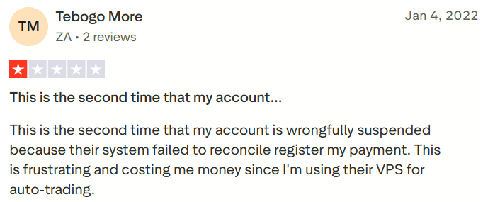 “This is the second time that my account is wrongfully suspended because their system failed to reconcile register my payment. This is frustrating and costing me money since I’m using their VPS for auto-trading.”— Trustpilot review