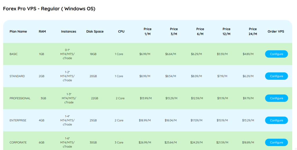 - FXVPSPro’s entry plan has only 1GB RAM and HDD storage — Windows Server alone consumes most of this, leaving minimal headroom for trading platforms.