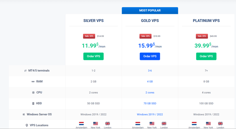- Silver: $14.99/month — 2 vCPU, 2GB RAM, 50GB SSD (up to 3 MT4 terminals)