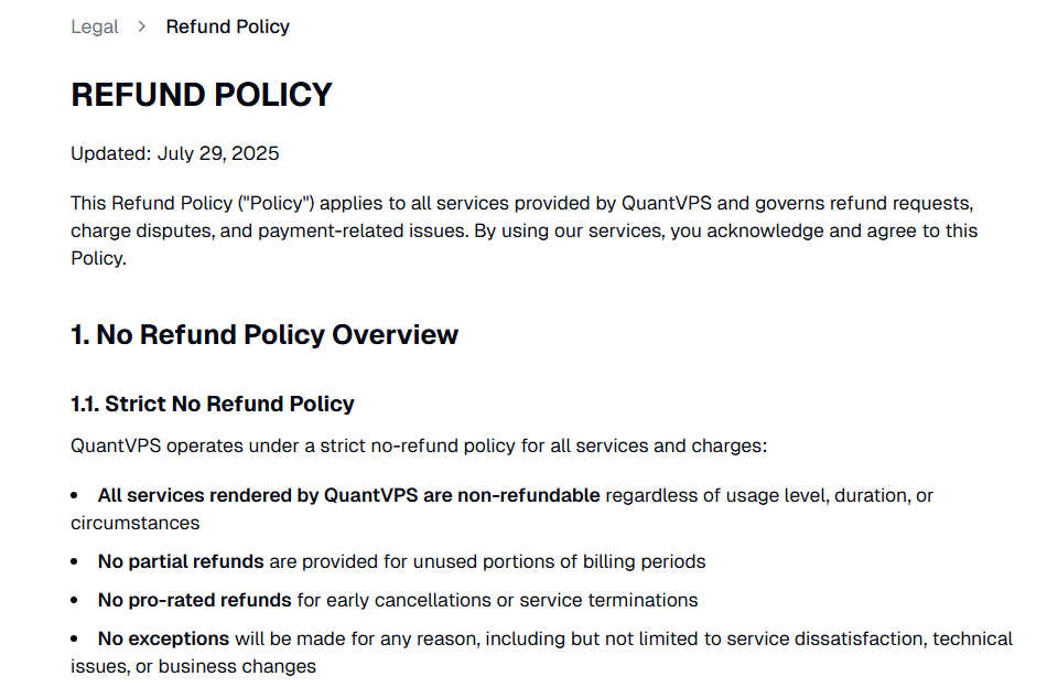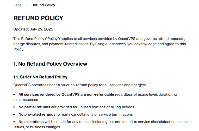 QuantVPS’s published legal terms include a strict no-refund policy. Once payment is processed, refunds are generally not available.