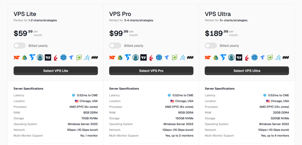 QuantVPS offers plans designed for futures trading workloads with higher baseline resource allocations: