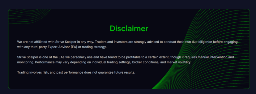 Their forex signals page includes a disclaimer stating they are “not affiliated” with Strive Scalper, yet they sell the EA license directly on their portal and prominently feature it on their website.