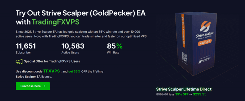 Beyond VPS hosting, TradingFXVPS also sells forex signals and promotes a third-party Expert Advisor called “Strive Scalper” on their website.