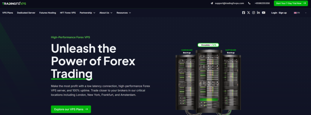 TradingFXVPS also offers separate Futures VPS (starting $40/month), HFT VPS (starting $75/month), and Dedicated Server plans (starting $165.84/month).