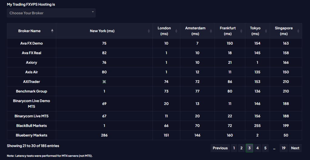 - TradingFXVPS’s latency checker is limited — MT4 servers only, no per-server data, and outdated broker information (some brokers have moved server locations)