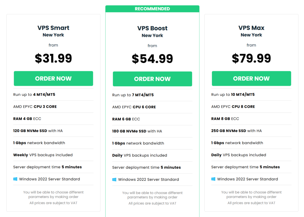 All NYCServers plans include: Windows Server, pre-installed trading platforms, broker-based automatic location selection, built-in monitoring, 24/7 support, and access to the trading-specific control panel.
